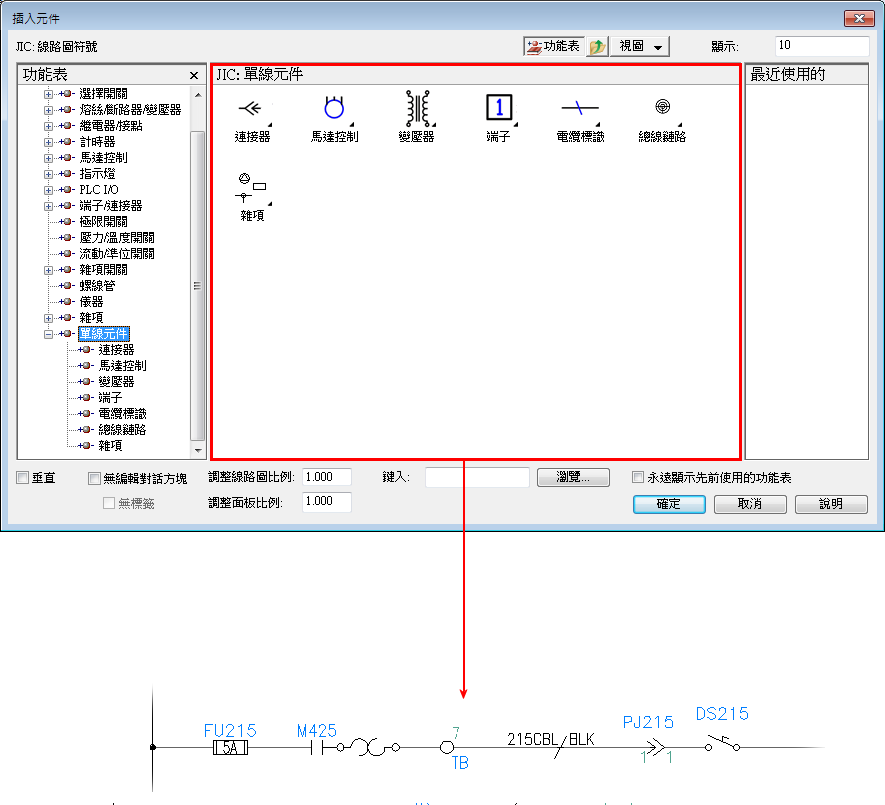 線路圖元件,例如繼電器、開關、指示燈以及分離式電動機控制裝置 (但並非 PLC I/O 符號),遵循以下命名慣例: