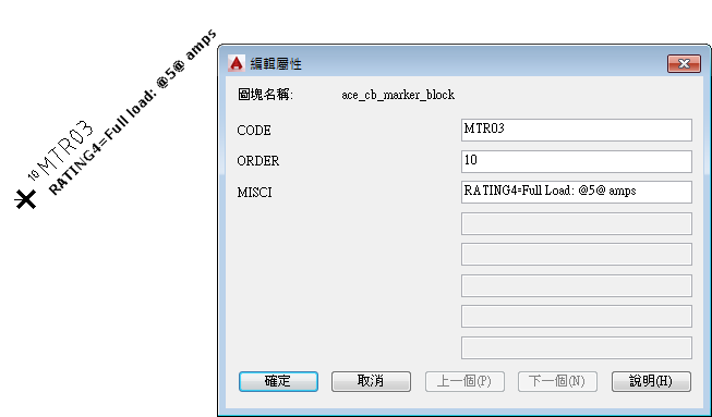 選取馬達電路後,將呼叫特殊馬達設置/註解功能。此特殊功能由具有標籤值的樣板上的標識圖塊以旗標方式標記,該值對映至 UI_TITLE 欄位中標記有「!MCC_CTRL」的電路代碼表單中的行。此功能參考 ace_electrical_standards.mdb 檔案以決定已選取的一組馬達輸入參數的目前滿載值和配線大小值。