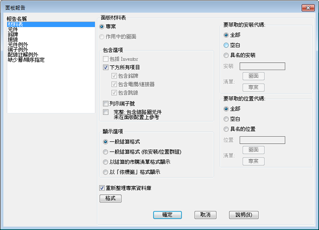 指定是處理專案、作用中的圖面還是處理選取的物件。如果選取專案,某些報告會提供一個選項,以選取要處理的圖面。