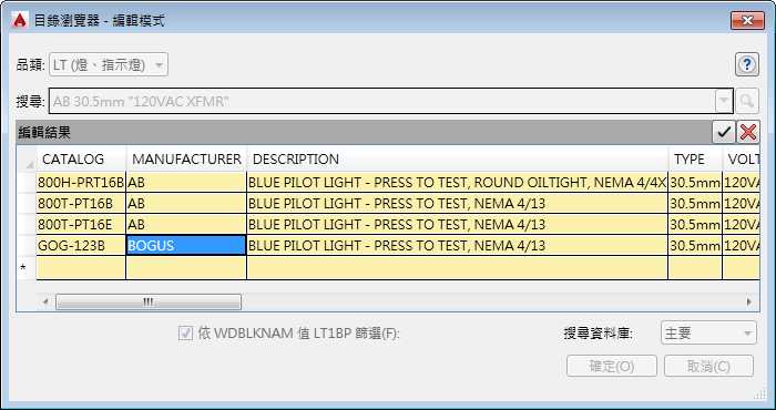 AutoCAD Electrical 提供了目錄資訊的範例。這些資訊保存在已植入了範例供應商資料的 Access 資料庫檔案 (.mdb) 內的表格中。