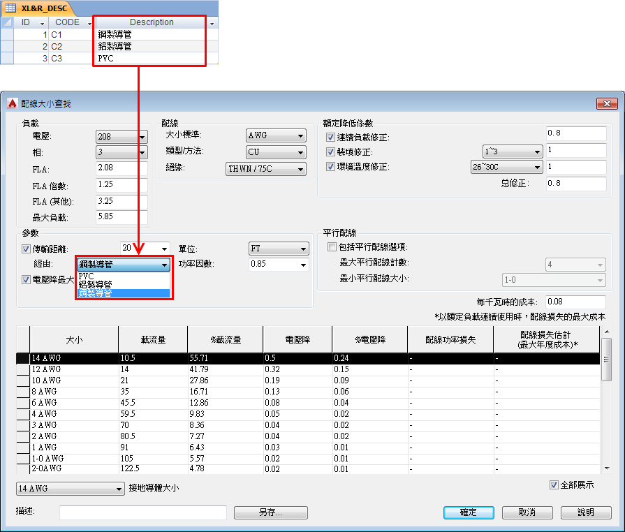 描述表格 XL&R_DESC 包含在「配線大小查找」對話方塊中用於導管或線槽類型選取清單的標示。還將標示對映到資料表格中的欄。