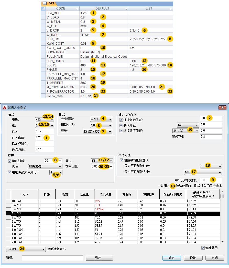 選項表格包含用於定義預設值的值,以及專用於 Electrical 標準的選項清單。例如,預設為銅製佈線、AWG 大小標準,以及用於導體長度單位的英呎。
