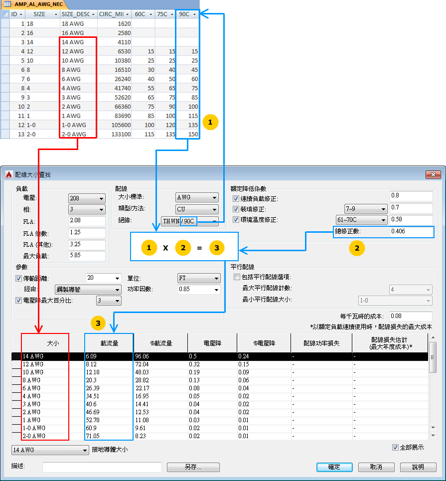例如,名為 AMP_CU_AWG_NEC 的表格包含關於銅製、AWG 大小的配線載流量資訊,並符合「國家電工法規」。