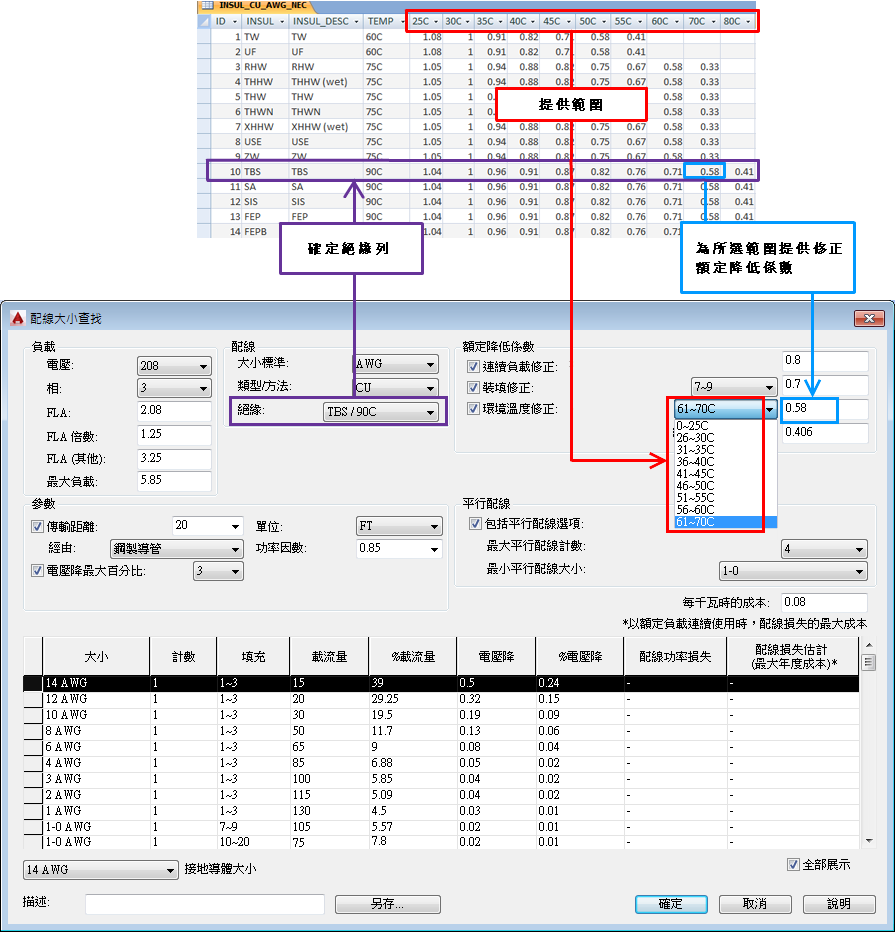配線絕緣表格可提供用於根據預期最大環境溫度額定降低導體載流量的選項。