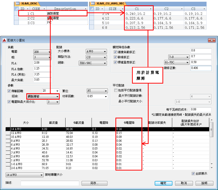 可選的導體電抗/交流電阻表格可根據導管類型提供配線大小的電抗和電阻。提供傳輸距離後,這些值可用於計算電源佈線中的電壓降百分比。