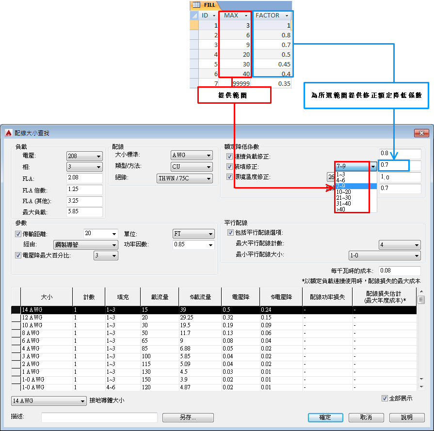 配線大小額定降低載流量的連續負載修正係數。如果期望將電力負載做為連續負載,預設的額訂降低係數可以自動套用到配線大小載流量計算中。 例如,給定的電力代碼將連續負載修正係數的值定義為 0.8。這表示當佈線要給預期為連續負載的馬達供電時,在正常情況下最大額定載流量值為 20 安培的給定配線大小,額定降低為最大載流量 16 安培。配線大小計算可能需要選取下一個較大的配線大小。 |