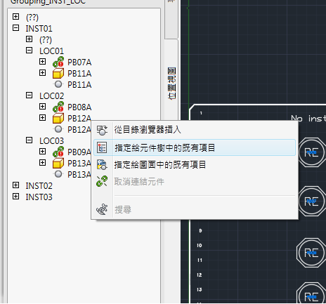 在「位置視圖」頁籤上,以滑鼠右鍵按一下 Inventor 零件,然後按一下「指定給元件樹中的既有項目」。
