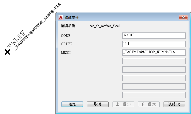 第二個 c:ace_cb_save 將馬達上的標籤 1 屬性值儲存至索引標籤為「@MOTOR_NUM@」的記憶體中。處理後續配線號碼標識圖塊時可參考此值。
