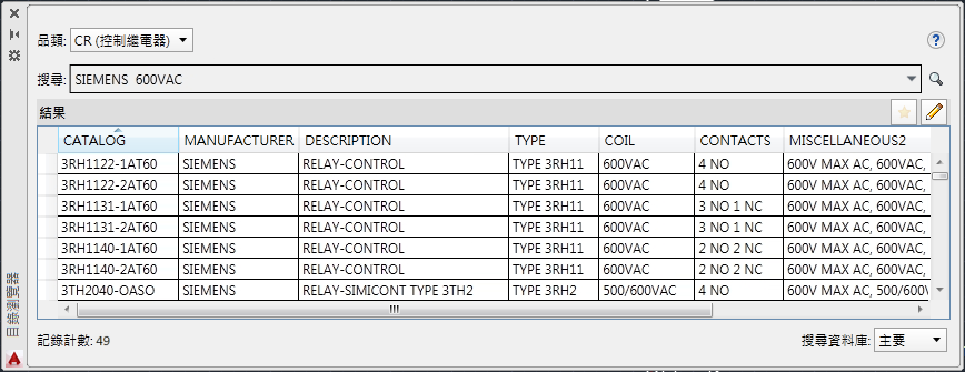 例如,當您對沒有目錄值的繼電器線圈按一下「查找」,您希望「目錄瀏覽器」搜尋「600VAC」繼電器的 Siemens 零件號碼。編輯目錄資料庫檔案,然後選取 _LISTBOX_DEF 表格。插入包含以下欄位值的記錄: