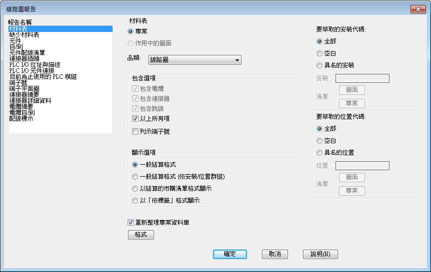 指定是處理專案、作用中的圖面還是處理選取的物件。如果選取專案,某些報告會提供一個選項,以選取要處理的圖面。