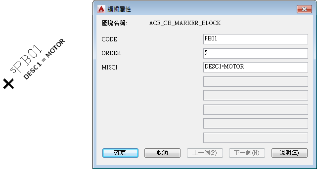 - 使用格式「{屬性名稱}={屬性值}」編輯其雜項 1 屬性值,例如,「DESC1=MOTOR」。