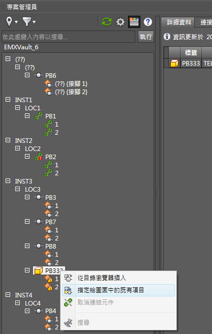 在作用中的圖面中,選取您想要與 Inventor 零件連結的 Electrical 元件。在您建立元件連結之後,元件樹狀檢視會重新整理,以展示連結的元件。