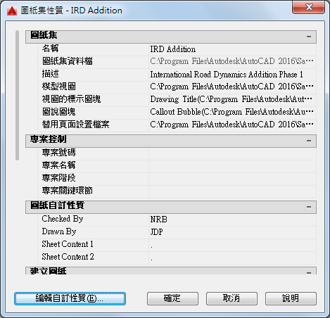 這包括如下資訊: 圖紙集資料 (DST) 檔的路徑和檔案名稱、包括與圖紙集相關聯之圖檔的資料夾路徑,以及與圖紙集相關聯的任何自訂性質。