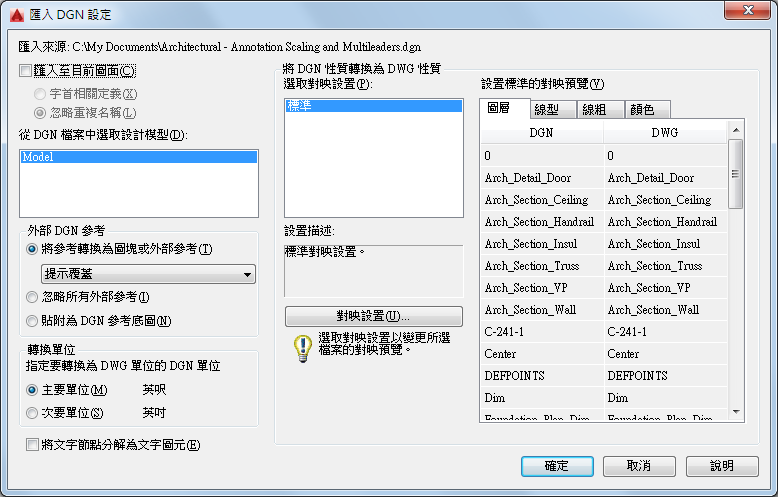 標準為預設對映設置,其從正匯出的圖面中萃取資料並將自動對映套用至 DGN 圖層、線型、線粗和顏色,如對映預覽所示。