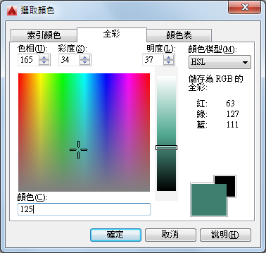 透過「色相」、「彩度」、「明度」(HSL) 顏色模型或「紅」、「綠」、「藍」(RGB) 顏色模型來指定使用全彩 (24 位元顏色) 的顏色設定。使用全彩功能時,可以使用一千六百多萬種顏色。「全彩」頁籤中的可用選項取決於指定的顏色模型 (HSL 或 RGB)。