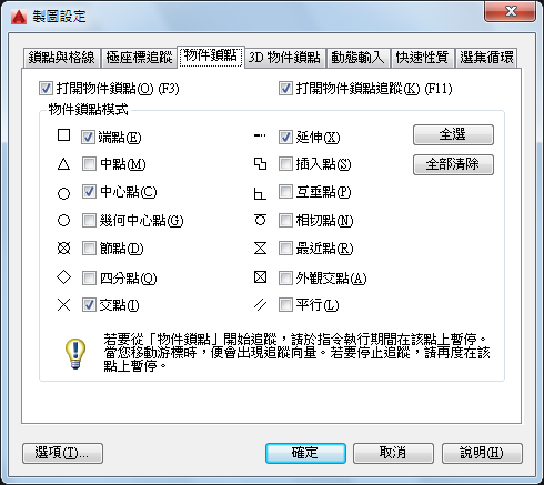 控制是否打開或關閉所有指定的物件鎖點模式。(OSMODE 系統變數)