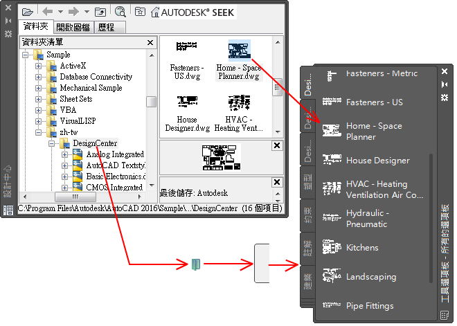 - 從設計中心拖曳圖面、圖塊與填充線。將加入到工具選項板中的圖面拖曳到另一個圖面時,這些圖面將做為圖塊插入。