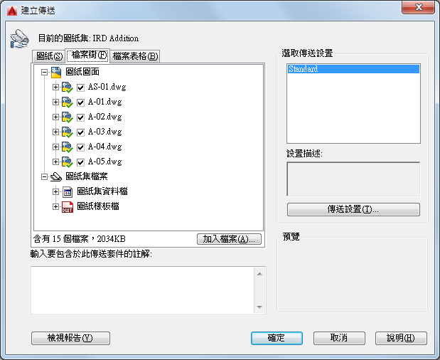依預設,目前圖面的所有相關檔案 (如相關的外部參考、出圖型式和字體) 都會列出。您可以將檔案加入到傳送套件中,也可以移除既有的檔案。URL 所參考的相關檔案不會併入傳送套件。
