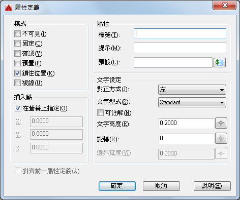 設定屬性文字的對正方式、型式、高度以及旋轉角度。