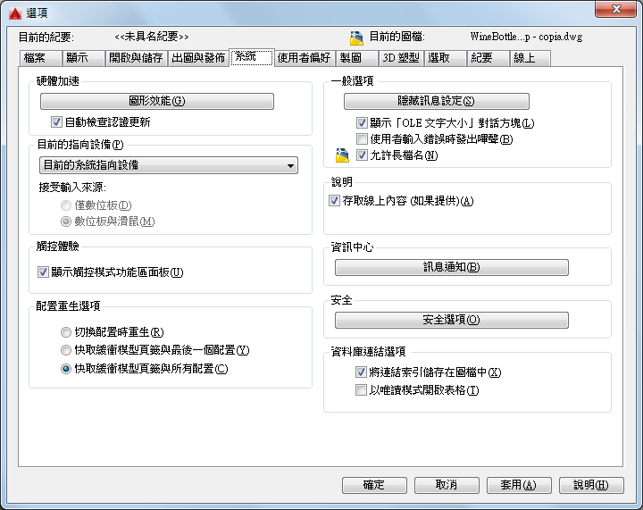 在每個頁籤中,顯示清單的更新方式一定是下列兩種方式之一:即切換至某頁籤時重生圖面,或先將顯示清單儲存至記憶體中,然後在切換至該頁籤時僅重生已修改的物件。變更這些設定可增進效能。(系統變數 LAYOUTREGENCTL)