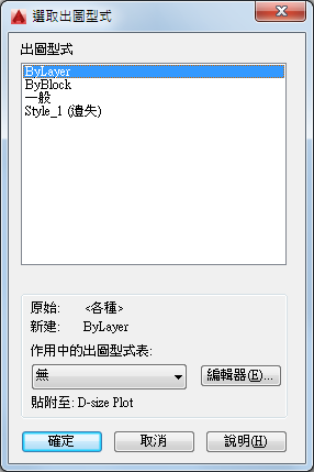 設定貼附到目前圖面的出圖型式表。出圖型式表會定義出圖型式。