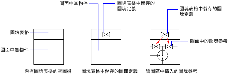下圖展示從空白圖面,透過建立圖塊定義,到於圖面中插入兩個圖塊參考的進展 (第二個影像展現一個儲存於圖塊表格中的圖塊定義,即使該幾何圖形已從其所儲存的繪圖區移除)。