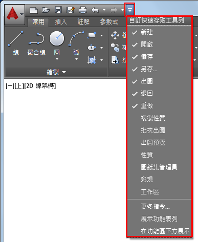 使用「自訂」按鈕,將「快速存取」工具列放置於功能去區上或下。