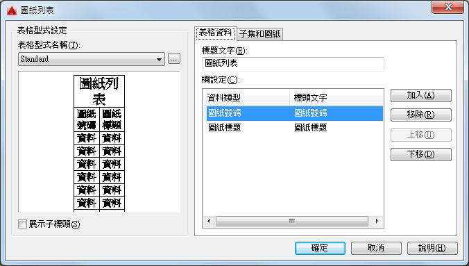 「編輯圖紙列表設定」對話方塊可讓您存取「插入圖紙列表」對話方塊中的所有設定。