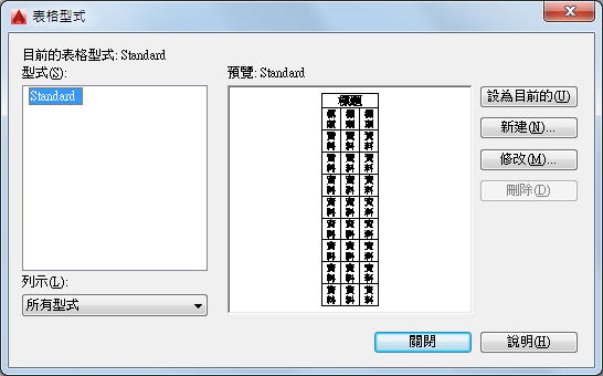 刪除在「型式」清單中選取的表格型式。但無法刪除圖面中正在使用的型式。