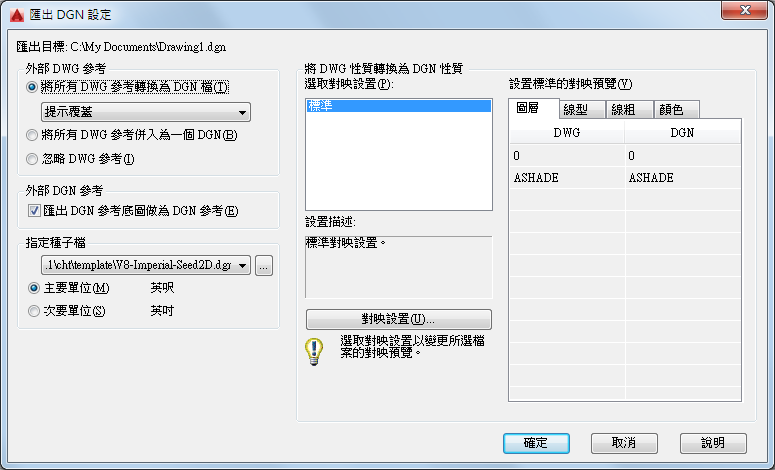 標準為預設對映設置,其從正匯出的圖面中萃取資料並將自動對映套用至 DGN 圖層、線型、線粗和顏色,如對映預覽所示。