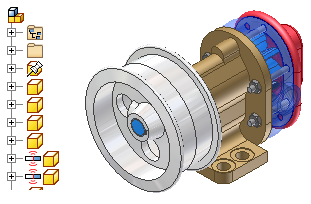 組合瀏覽器是啟用您要編輯的元件的便捷方法。使用瀏覽器編輯草圖、特徵和約束,打開和關閉元件可見性,以及執行其他工作。在組合的以下影像中,其中兩個元件顯示指示它們是接觸集之零件的圖示。屬於接觸集的元件的行為與其實際的行為相同。