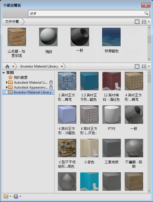 Autodesk Appearance Library 隨產品或套件安裝,可提供各種各樣的外觀資產。AutoCAD、Inventor 和 Revit 等產品可共用此唯讀資源庫,以確保產品之間提供更一致的檢視體驗。