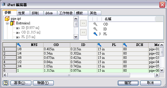 例如,開啟範例管 iPart Autodesk\Inventor Professional <版本>\Tutorial Files\Tube & Pipe\Example_iparts\pipe.ipt。在模型瀏覽器中,按兩下「表格」,開啟「iPart 建立」對話方塊: