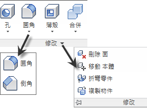有數個指令已從主面板移至子面板,或面板上的下拉式清單。例如,在零件檔 (.ipt) 中,「3D 模型」頁籤上的「修改」面板現在簡化為依預設顯示較少的指令。其他修改指令被移至下拉式功能表或「修改」的展開面板: