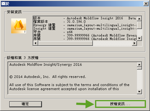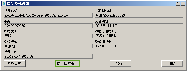 您可以按一下「說明」 > Autodesk Moldflow Insight 2016 > 「授權資訊」以開啟「產品授權資訊」,然後按一下「歸還授權」,提前歸還授權。