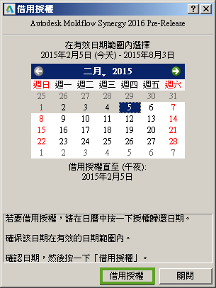 為方便您操控模型或分析結果、離線、使用網路授權,現在可以借用 Autodesk Moldflow Synergy - 使用者介面 授權。