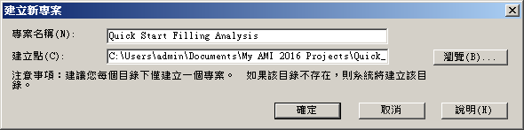 在「新專案」對話方塊中,輸入專案名稱 Quick Start Filling Analysis,然後按一下「確定」。