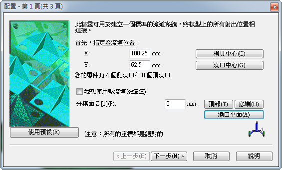 按一下「澆口平面」,然後按一下「下一步」。
