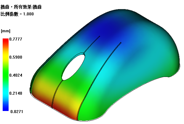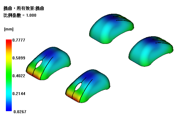 此結果展示所有四個零件的翹曲。翹曲看起來大致相同。