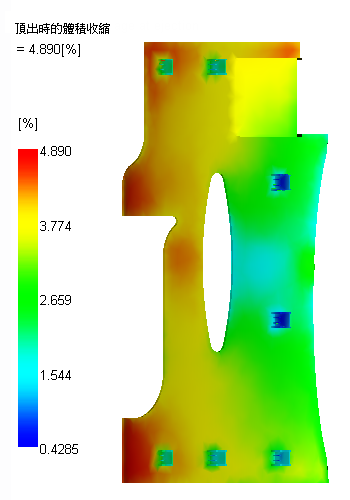 此零件的標稱壁厚為 3 mm。此材料的體積收縮範圍通常介於零件 (包含此厚度) 的大約 0.5% 至 4.25% 之間。但是,較小的收縮變化優先。最大收縮接近 5%,而標稱壁的最小收縮約為 1.7%。如果零件的大部分收縮低於 2% 會更好。主要問題是充填結束時的收縮較高。