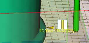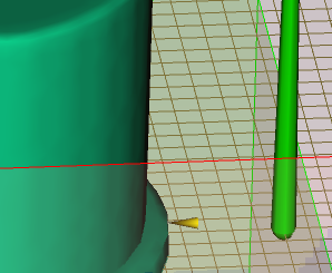 「選取」工具 (),按一下豎流道底部,然後將指標拖離豎流道,拖向射出位置。會出現一條末端有黃色小球的黃色細線。這個球表示流道末端。由於已在「建立流道」對話方塊中選取「鎖點至格線」選項,因此小球將跳至最近的格線交點。