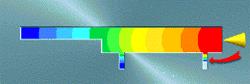 下圖所示的澆口放置方式只能使情況略有好轉,這是因為相較於較薄部分而言,聚合物在較厚部分的流動仍然比較順暢,進而導致較薄部分發生遲滯,如紅色箭頭所指示。