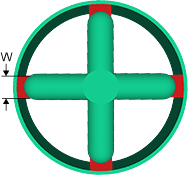 輪輻澆口也稱為四點澆口或十字澆口,如下圖所示。此澆口適用於管狀零件,可使澆口更容易移除並能節省材料。缺點是可能會導致出現熔接線,而且不可能形成完美的球形。