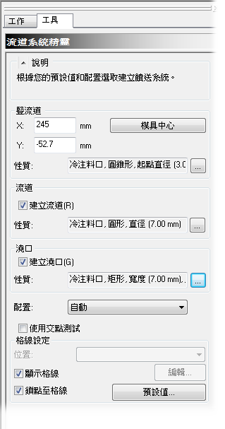 在此工作中,您將使用「流道精靈」建立流道系統。
