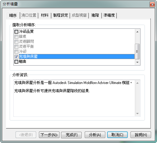 勾選「充填與保壓」做為分析順序,然後按一下「下一步」。