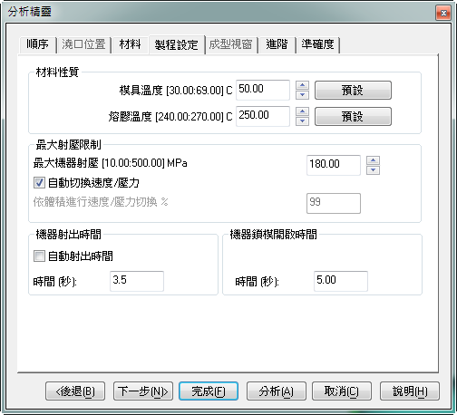 按一下 (「常用」頁籤 > 「成型製程設置」面板 > 「分析精靈」)。