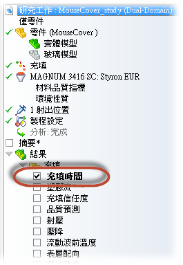 在此工作中,您將檢閱「充填時間」結果。