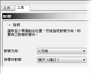 從「與零件對齊」欄位中選取「模穴 1/澆口 1」。