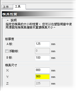 在此工作中,您將定義模具大小。「A」板的厚度會決定豎流道的長度。