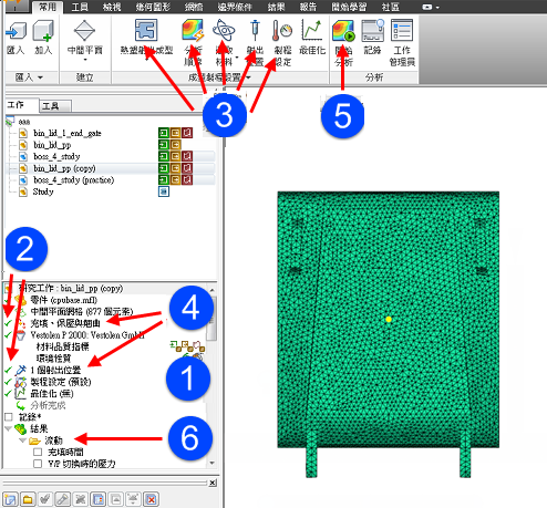 例如,若您在 「分析順序」圖示上按一下右鍵,可以變更分析順序。或者,您可以按一下 (「常用」頁籤 > 「成型製程設置」 > 「分析順序」),使用功能區功能表來執行這一工作。